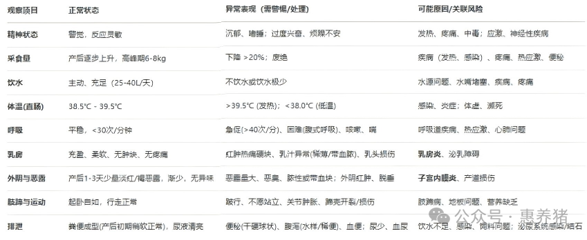 “四看”原则:看母猪(精神、食欲、奶水、恶露)、看仔猪(活力、吃奶、腹泻、均匀度)、看环境(温度、湿度、卫生)、看设备(水电、保温、栏位)。