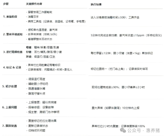 1、频次:至少每天4次(早晨喂料前、上午、下午喂料后、晚上最后一次喂料后/熄灯前)。产后24-72小时母猪及仔猪应增加巡视频次(如每1-2小时)。