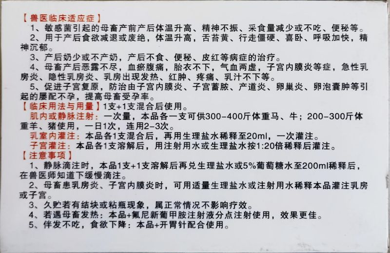 【临床应用】:母畜产前产后疾病、呼吸道和消化道疾病。