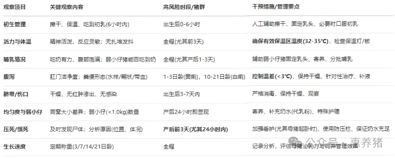 重点观察仔猪:活力、分布(是否在保温区)、哺乳情况、有无腹泻、脐带伤口、弱小仔。
