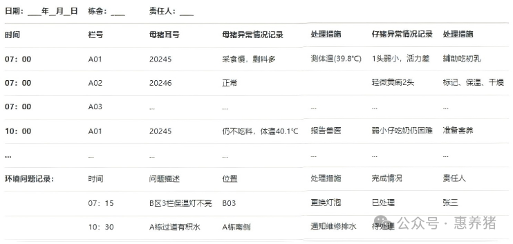 标记与记录:发现异常猪只或问题,立即用记号笔在栏位或母猪卡上做明显标记(如发烧、不吃、腹泻、弱小仔)。在记录表上详细记录(时间、栏号、问题描述、初步处理)。