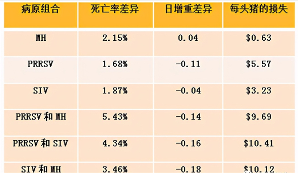 诚然,现在导致养猪亏损的主要原因是生猪价格持续低位运行和饲料价格持续保持高位,但其实疾病导致的猪场损失同样很大。据美国科学家统计,单纯的支原体感染导致的损失为0.63美元/头,而如果混合蓝耳、流感病毒感染,那导致的损失会大幅度提高,比如支原体同蓝耳混合感染,每头猪的损失接近10美元,而如果是流感同支原体混合感染,一头猪的损失达到了10.12美元。因为支原体作为原发病,其会严重破坏猪群的呼吸道纤毛,导致呼吸道纤毛脱落,猪群呼吸道在失去纤毛的保护后不仅会增加蓝耳、圆环、流感的发病率,还会加大疾病造成的损失。